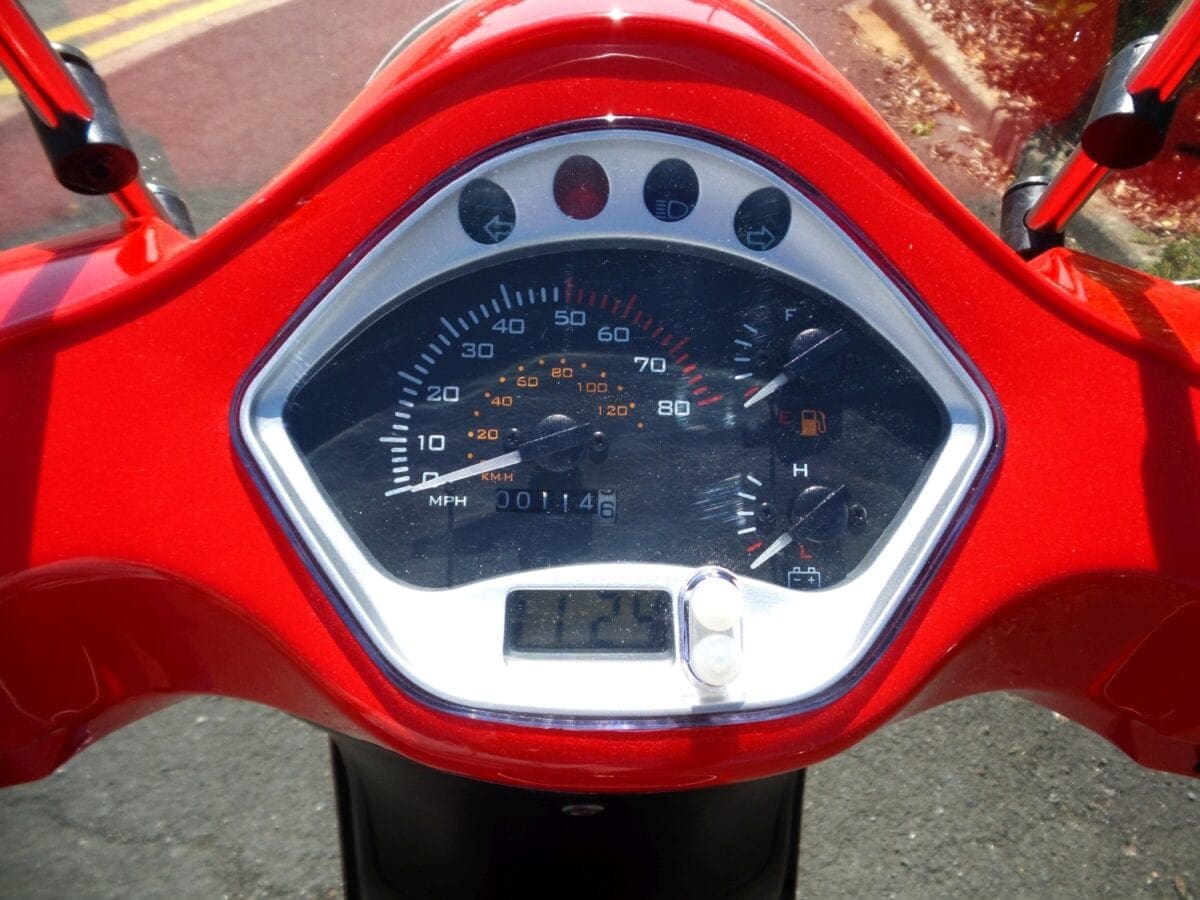 To be honest, the paint quality and overall finish is higher than you could normally expect for a scooter that costs a tad over a grand on the road. Three colour options are available – I had a red one which actually looks quite stunning. The addition of a flyscreen, mirrors and a very handy rear rack all go a long way to enhancing the bike’s appearance, especially with the 5-spoke alloy wheels fitted as standard. The instrument cluster is well laid out with an array of warning lights, a large speedometer (strangely market in red from 50mph upwards), fuel gauge, battery condition indicator and an inset digital clock. The underseat storage space swallowed up the Shoei J-Cruise helmet I was wearing on the test ride. There’s also a useful glovebox.