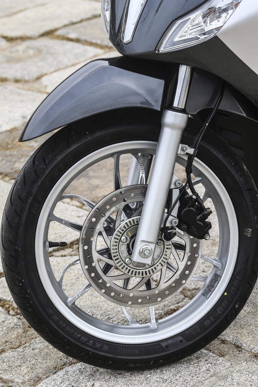 Bigger-wheeled scooters usually handle well, and the Medley is no exception, with the 16-inch front, 14-inch rears giving stable handling through town and also up in the twisties above the Italian coast, while the suspension coped well with cracked tarmac and potholes. Used hard, the ABS comes on quite early, but I’d still rather have it than not, and the Maxxis Extramaxx tyres gripped well.